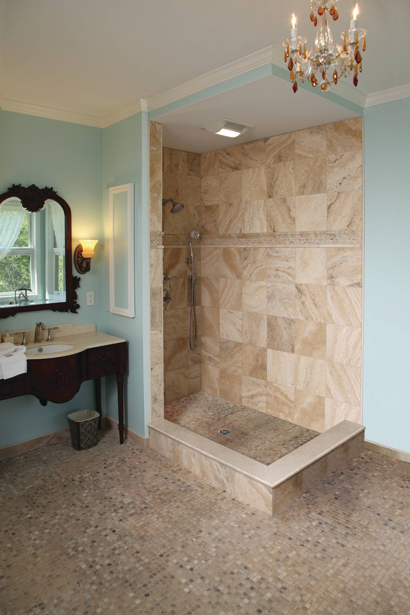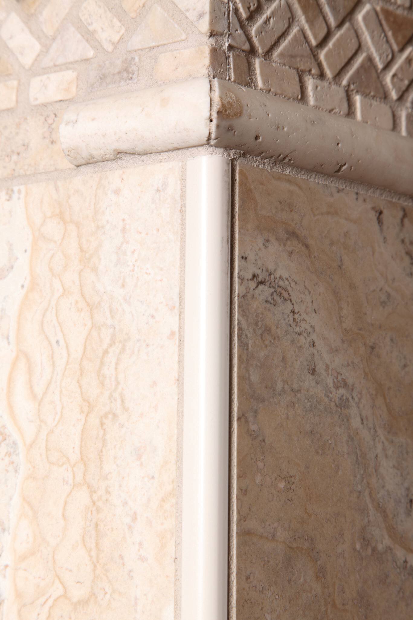 La baldosa elegida para esta ducha ofrecía hermosos listeles, pero no contaba con baldosas de canto redondeado para los bordes. Los perfiles de color beige claro se integraron perfectamente con la baldosa y eliminaron la necesidad de utilizar baldosas de canto redondeado a juego. Perfil de remate RONDEC utilizado para acabar los bordes de las baldosas en la pared y en la base de baldosas.