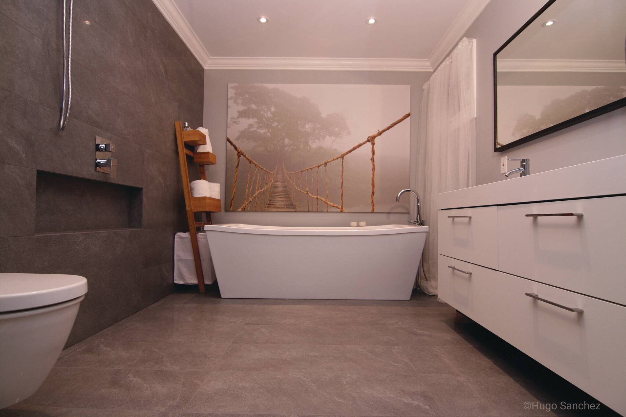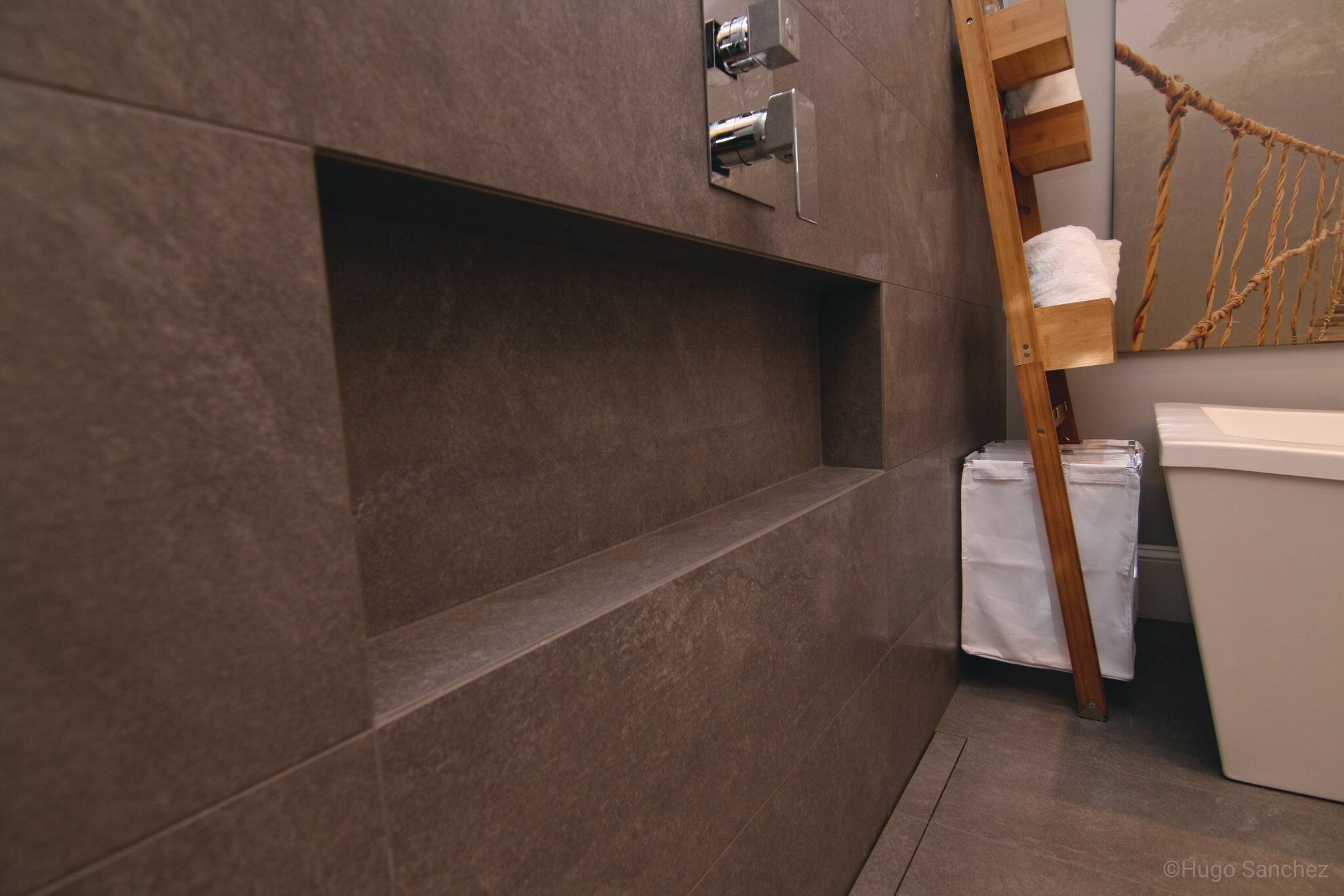 ¡La falta de paredes de ducha no significa falta de almacenamiento en este cuarto de baño revestido de baldosas! El nicho de la ducha y toda la pared están impermeabilizados con la membrana KERDI.