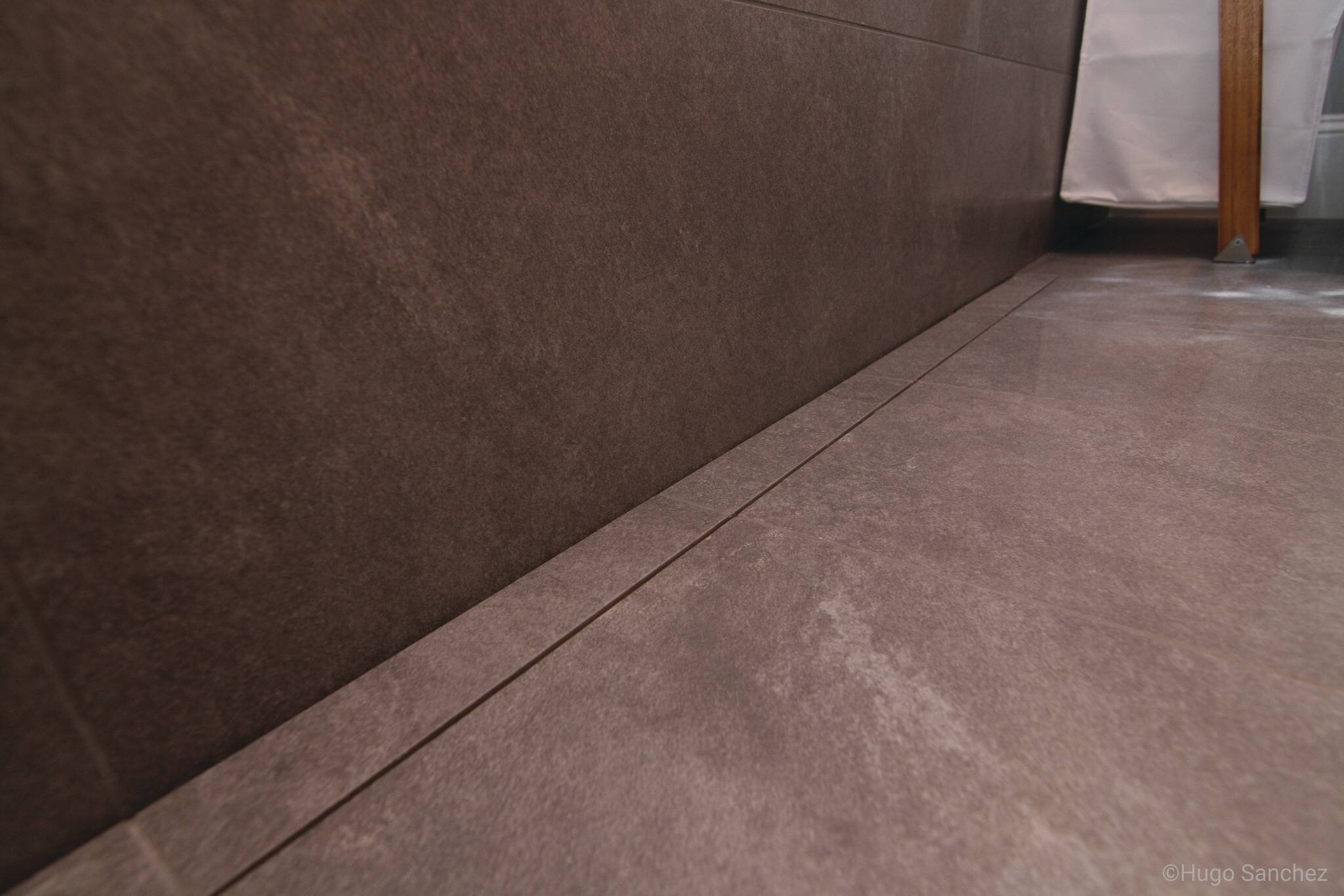 El drenaje lineal KERDI-LINE con la rejilla TILE se integran tan naturalmente en esta habitación, que es difícil verlo.
