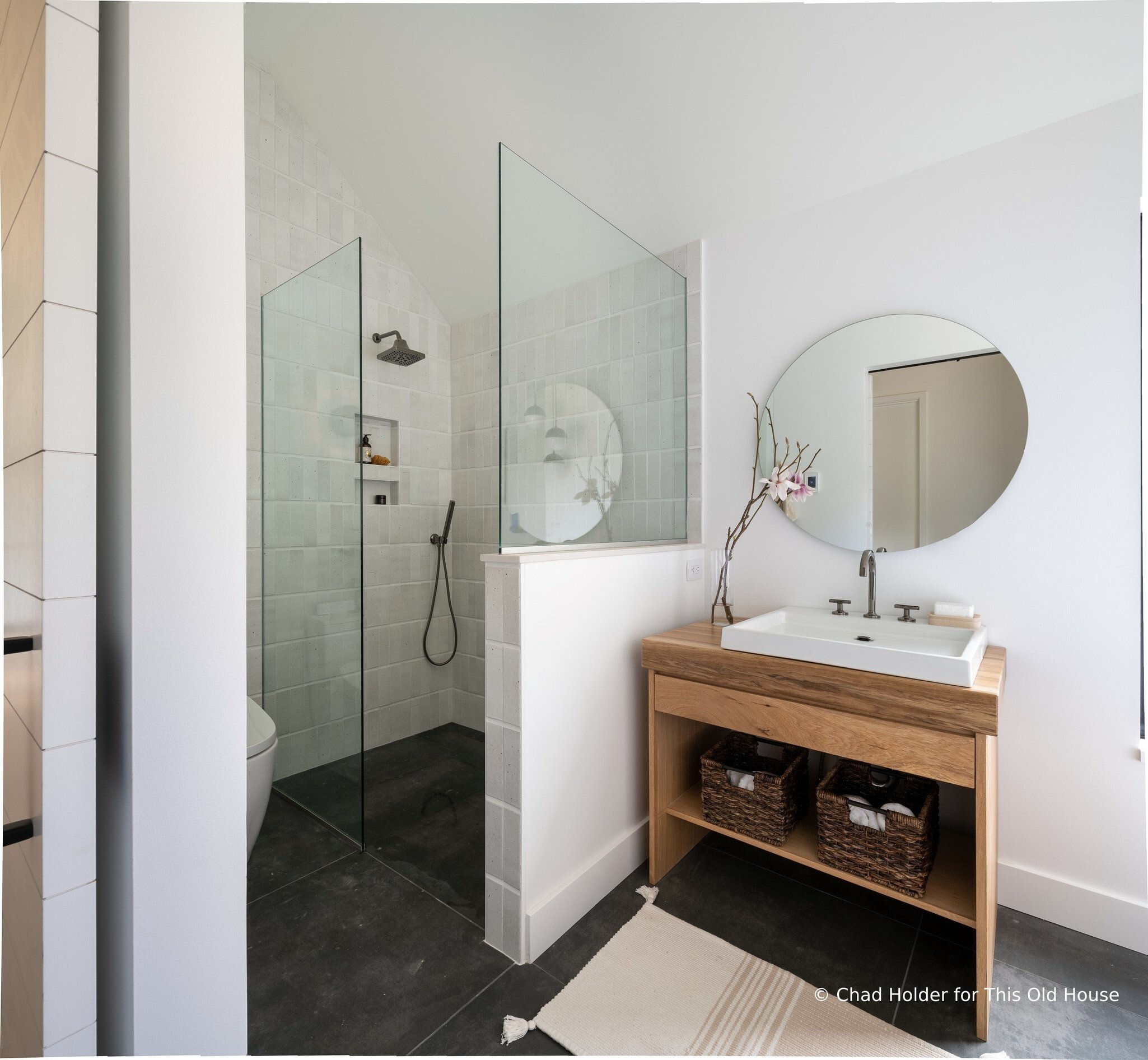Los pisos de baldosas de pizarra se calientan con DITRA-HEAT que recorre todo el piso y la ducha. Un desagüe KERDI-LINE se integra perfectamente.