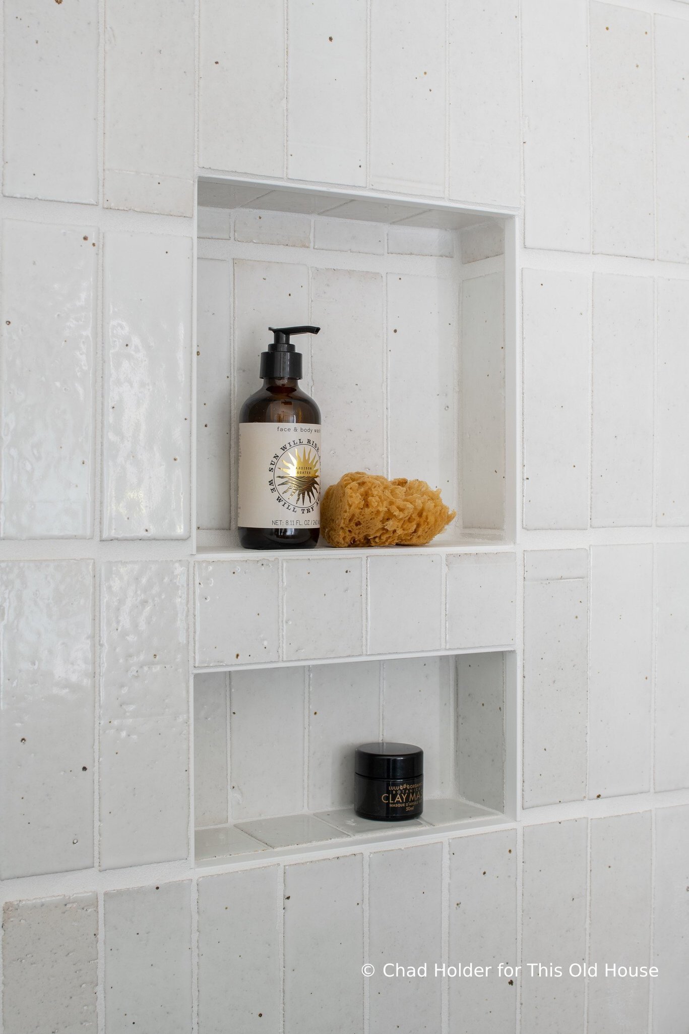 Un nicho personalizado KERDI-BOARD enmarcado por el perfil JOLLY en Bright White mantiene todas las comodidades organizadas y al alcance de la mano.