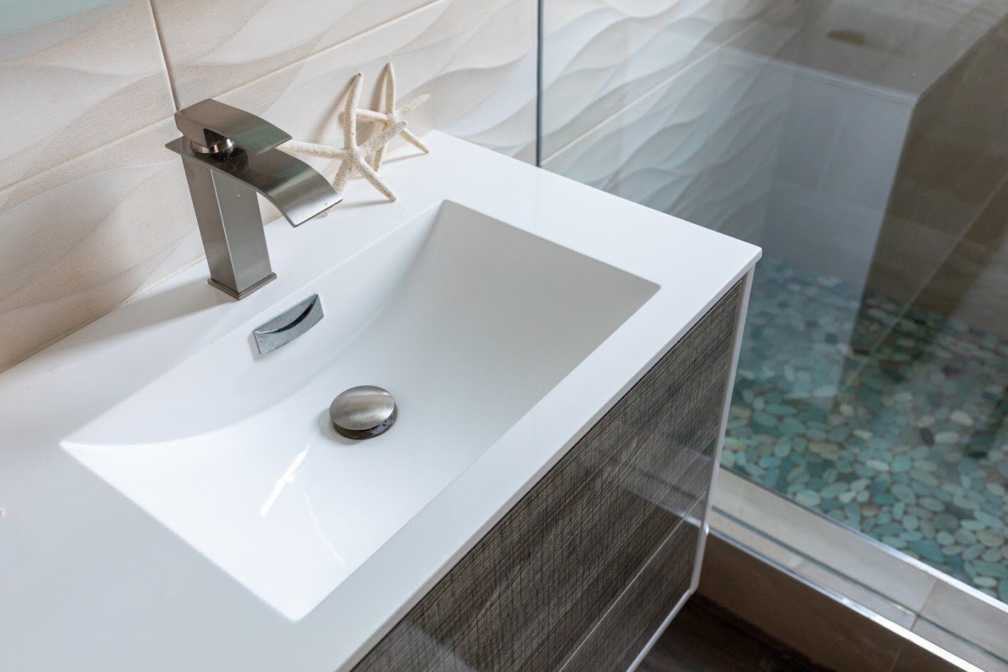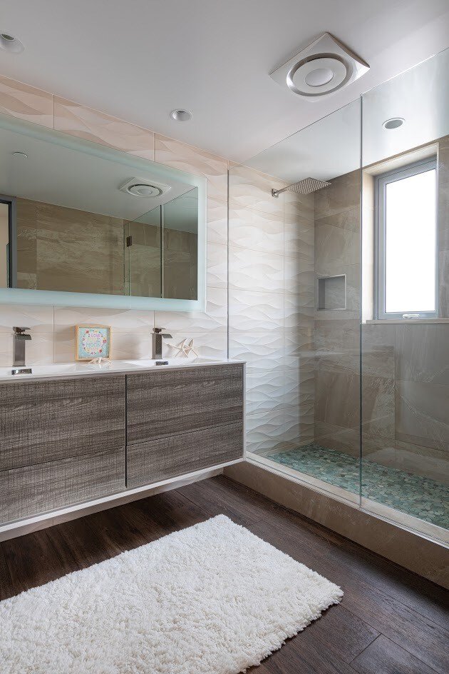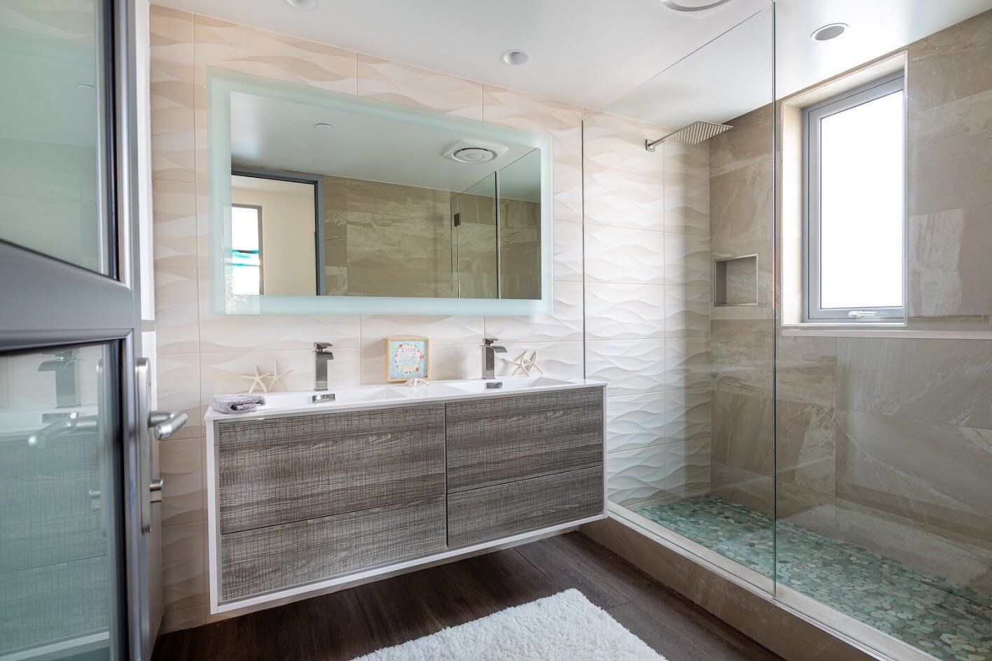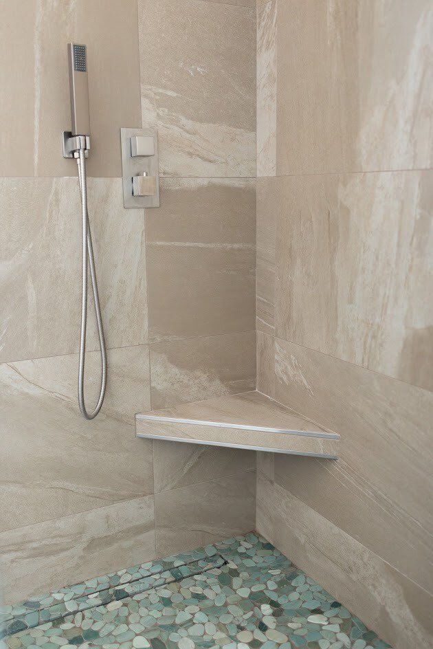 La energía de la playa vibra con una paleta neutral y accesorios frescos. Complete el sistema de ducha Schluter con una bandeja de ducha, perfiles de acabado y una rejilla KERDI-LINE TILE.