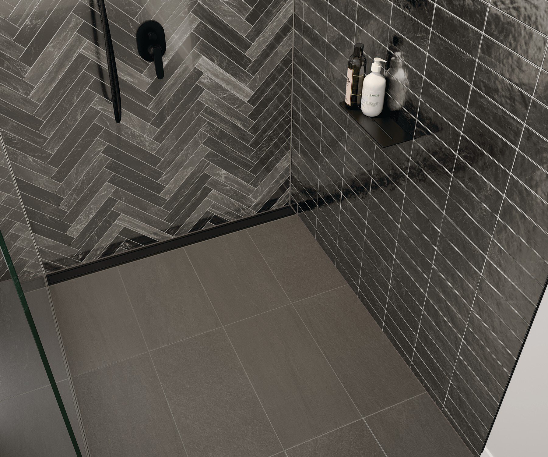 El desagüe lineal KERDI-LINE en negro mate combina con el estante y los accesorios de ducha para lograr una apariencia cohesiva y elegante.